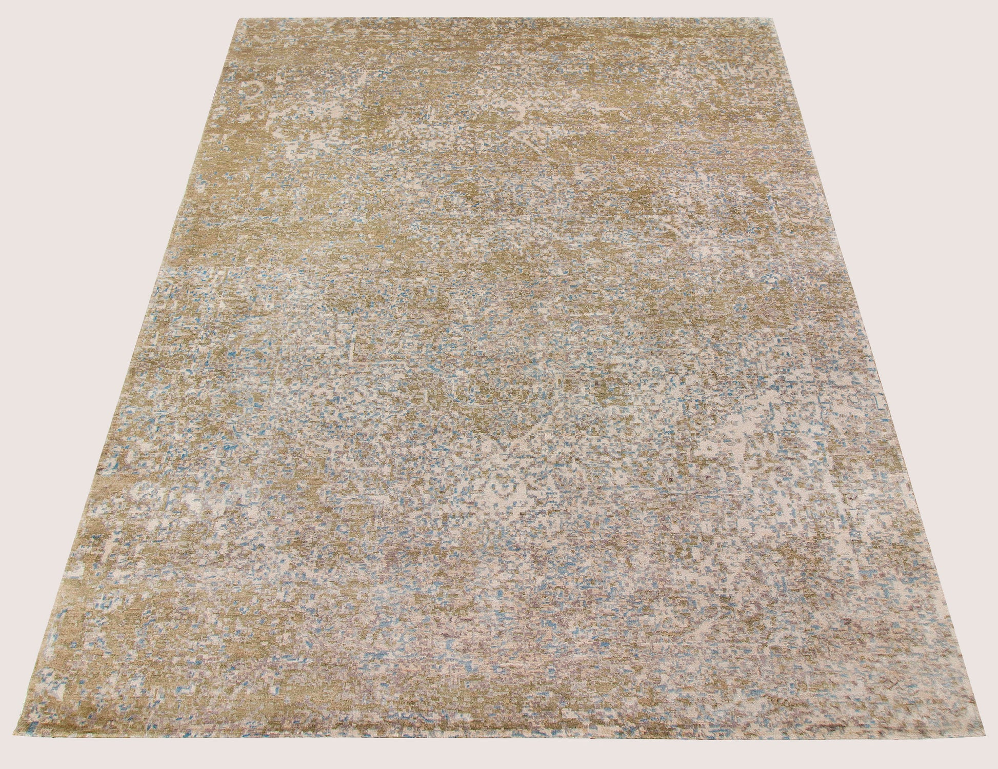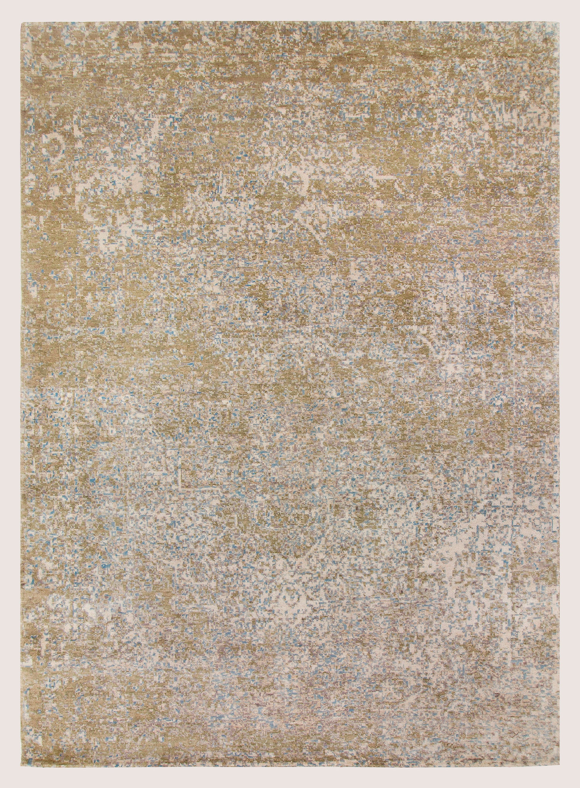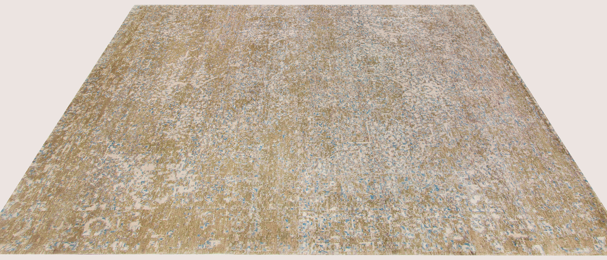 Dominated by warm gold tones, the rug is beautifully accented with hints of soft blue and muted ivory. This harmonious color palette evokes a sense of warmth and tranquility, perfect for creating an inviting atmosphere.