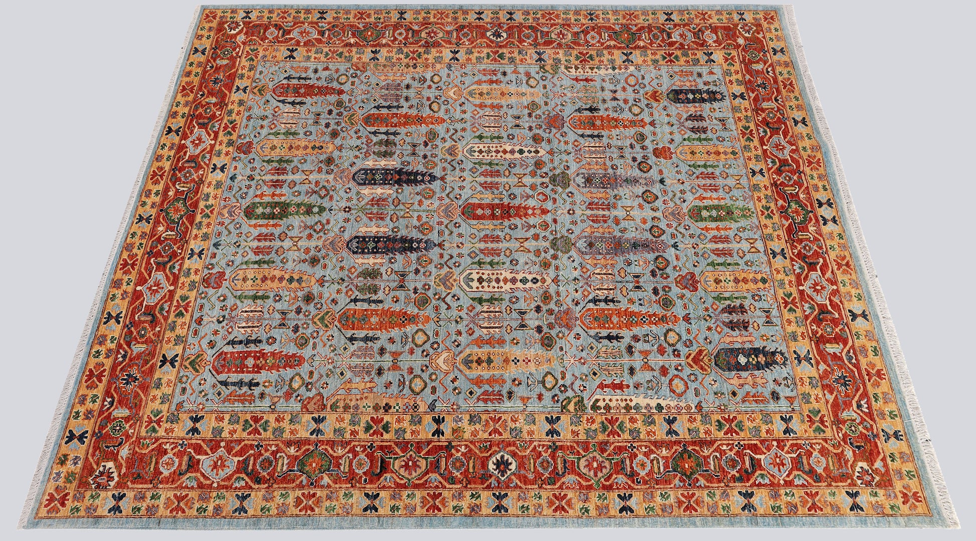 While the rug maintains a traditional style, the use of modern tones brings a fresh perspective to its design. The muted blue background serves as a contemporary canvas that enhances the vibrant motifs and creates a balanced contrast. This blending of old and new allows the rug to fit seamlessly into various interior design styles, from rustic to modern.