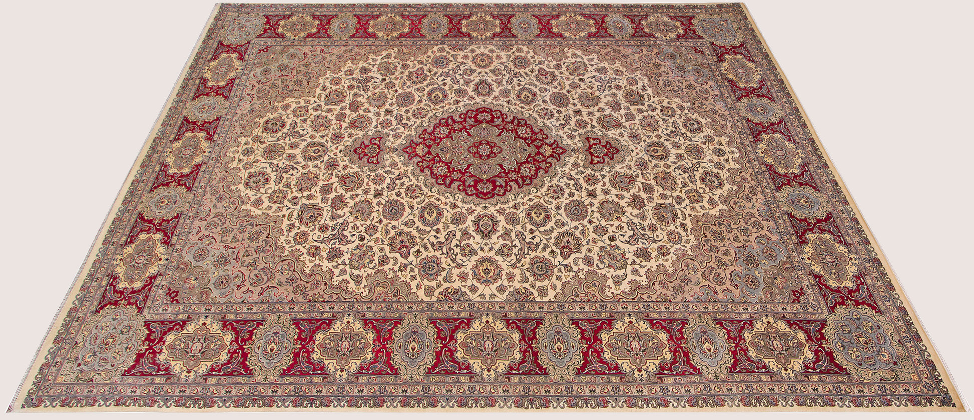The rug showcases a harmonious blend of deep reds, golds and creams, which contribute to its classic appeal. These colors have been cherished for generations, enhancing its traditional character.